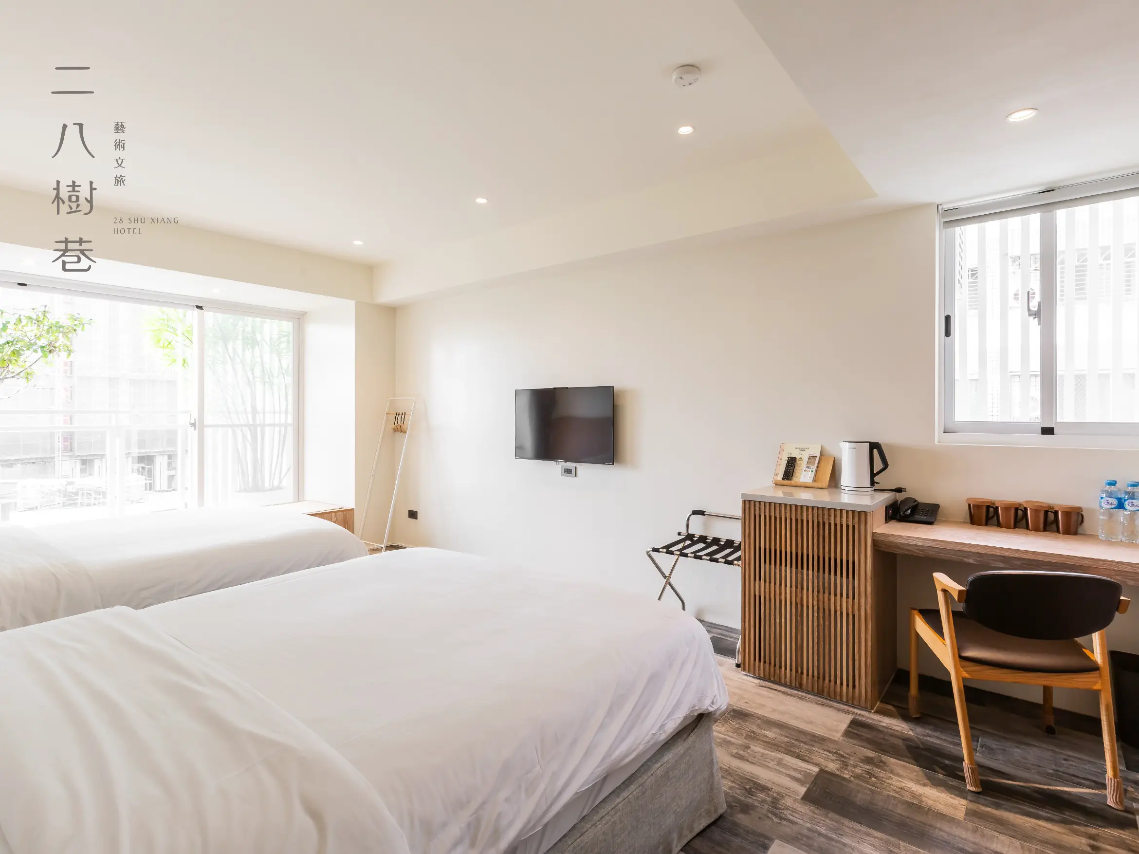 此房型有設置兩張標準五尺雙人床,全家人一同出遊也沒問題,因為擁有絕佳的視野,所以我們在大面落地窗邊設計了一處榻榻米臥榻,讓您可以坐在大面透明落地窗邊,欣賞著窗外的景色,在這裏要坐要躺隨您喜歡,把繁雜的俗事拋在腦後,輕鬆地與家人一同在二八樹巷家庭房度過美好的一晚。