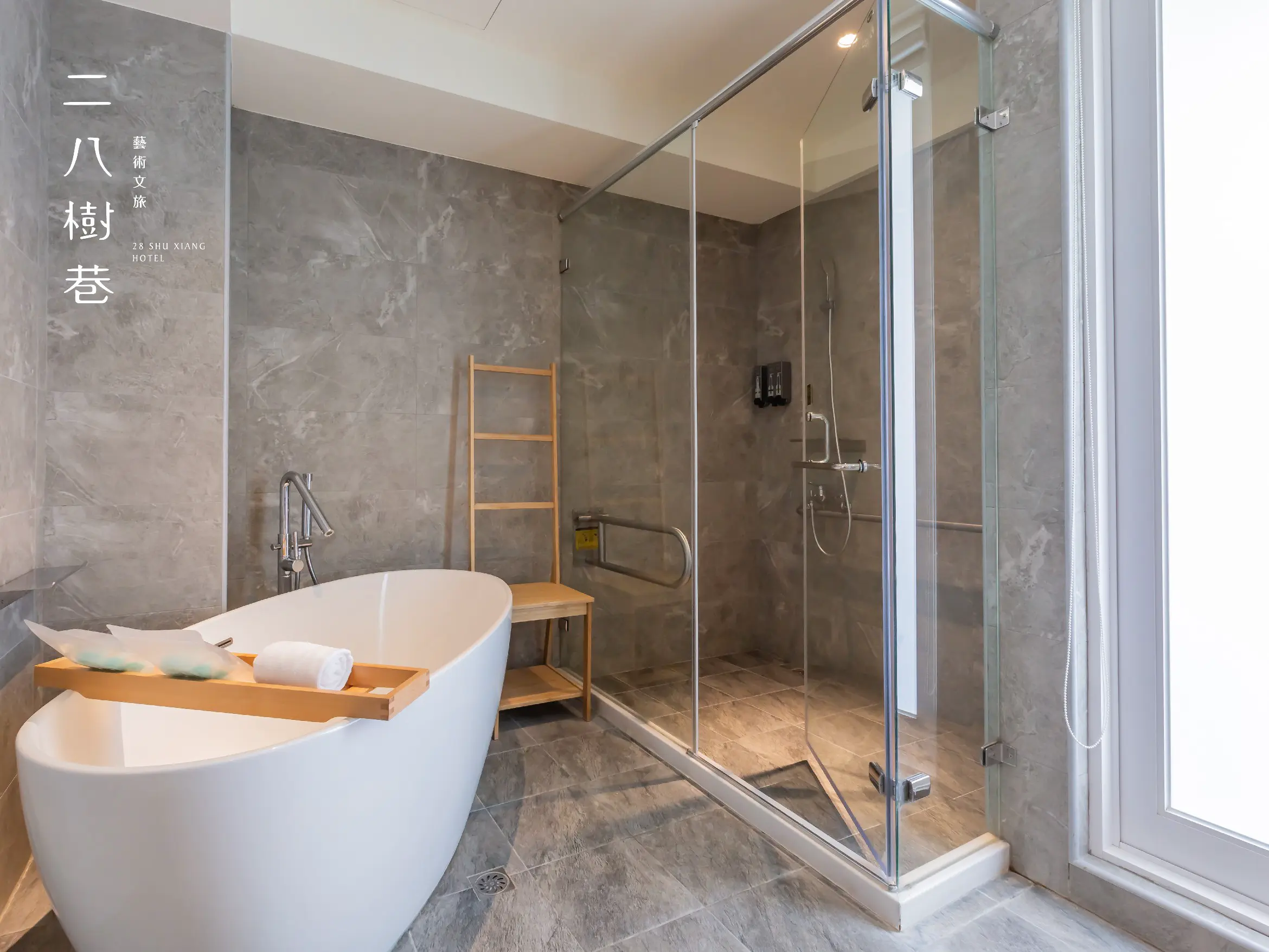 二八樹巷最友善的房型,如果此次旅行有長輩同行,或與行動不便人士一同出遊,此房型在浴室裡設置了安全扶手,讓有需要的朋友在浴室中有更多的安全協助,同時浴室裡也同樣配備獨立蛋型浴缸,讓辛苦的旅途後依然可以得到舒舒服服的熱水澡。